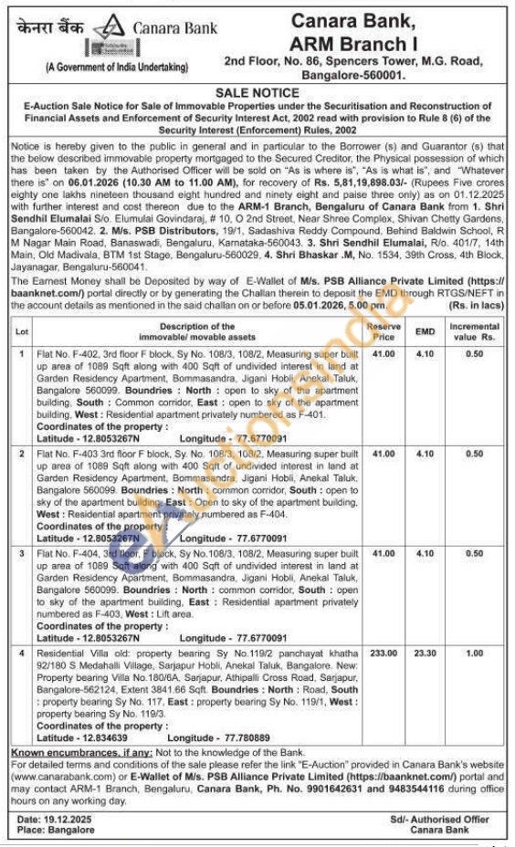 1)Flat No. F-402, 3rd floor F block, Sy No. 108/3, 108/2, Measuring super built up area of 1089 Sqft along with 400 Sqft of undivided interest in land at Garden Residency Apartment, Bommasandra, Jigani Hobii, Anekal Taluk, Bangalore 560099. Boundries North open to sky of the apartment building, South Common corridor, East: open to sky of the apartment building. West: Residential apartment privately numbered as F-401.