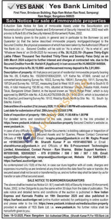 Description of property: All that piece and parcel of residential immoveable property bearing Site No. 09, E-Katha No. 150200101800422091, VP Katha No. 4739/9, carved out of converted lands bearing Survey No. 193/2, Survey No. 196/A1, Survey No. 191/1, Survey No. 197/2A and Survey No. 197/20, measuring East to West 18.51 mirs, and North to South 8.15 mitrs, in total measuring 150.86 sq. mtrs, situated at Marasur Village, Kasaba Hobli, Anekal Taluk, Bangalore Urban District, in the layout known as "Wood Ridge Pride", which is duly approved by BMRDA vide No. A.DA/LAO/76/2008-09, Dt: 19-06-2014, which is bounded on the: East by Land bearing Survey No. 191/2, West by Road, North by Site No. 10, South by: Site No. 8 and 9