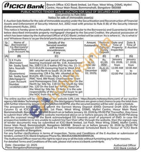All that part and parcel of the property bearing municipal old No. 119, Assessment No. 2067/119, E katha (PID No.) No. 21-1-513-61A2N measuring East to West 9.14 Mtr. and North to South 15.24 Mtr. in total measuring 139.4 Sq. Mtr. situated at No. 61A2N, 4th Cross, Block 1. Ward No. 21, RMC Yard, BM Road, Channapatna Town and Ramanagara Dist. Bounded By: On the North by: Site No. 118 On the South by: Site No. 120 On the East by: APMC Road On the West by: Site No. 70 Note: It is the sole responsibility of the successful buyer to get the NOC from the APMC, Channapatna.