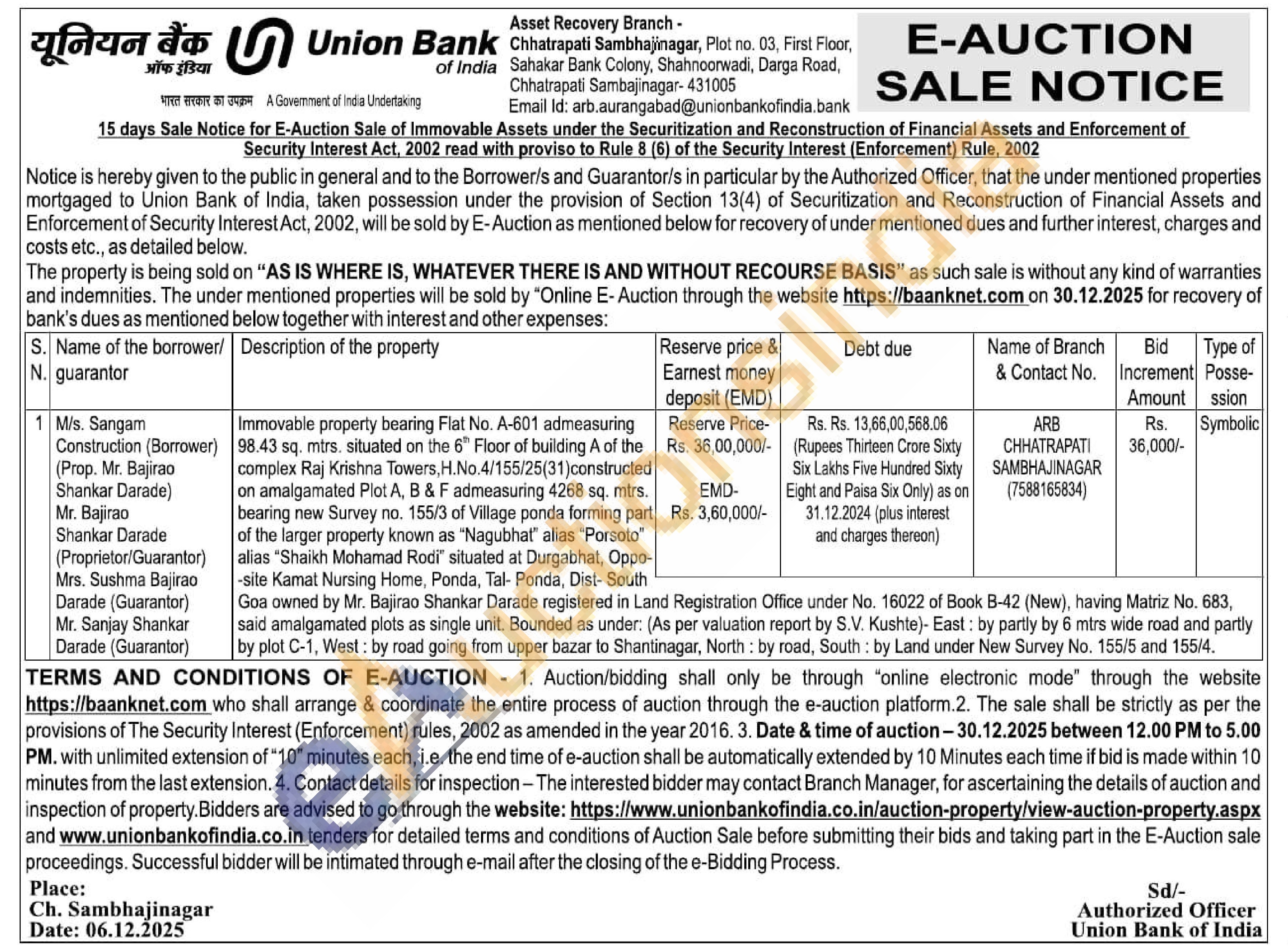 Immovable property bearing Flat No. A-601 admeasuring 98.43 sq. mtrs. situated on the 6th Floor of building A of the complex Raj Krishna Towers, H.No.4/155/25(31) constructed on amalgamated Plot A, B & F admeasuring 4268 sq. mtrs bearing new Survey no. 155/3 of Village ponda forming part of the larger property known as "Nagubhat" alias "Porsoto" alias "Shaikh Mohamad Rodi" situated at Durgabhat, Oppo--site Kamat Nursing Home, Ponda, Tal- Ponda, Dist- South Goa owned by Mr. Bajirao Shankar Darade registered in Land Registration Office under No. 16022 of Book B-42 (New), having Matriz No. 683, said amalgamated plots as single unit. Bounded as under: (As per valuation report by S.V. Kushte)- East: by partly by 6 mtrs wide road and partly by plot C-1, West: by road going from upper bazar to Shantinagar, North: by road, South: by Land under New Survey No. 155/5 and 155/4.