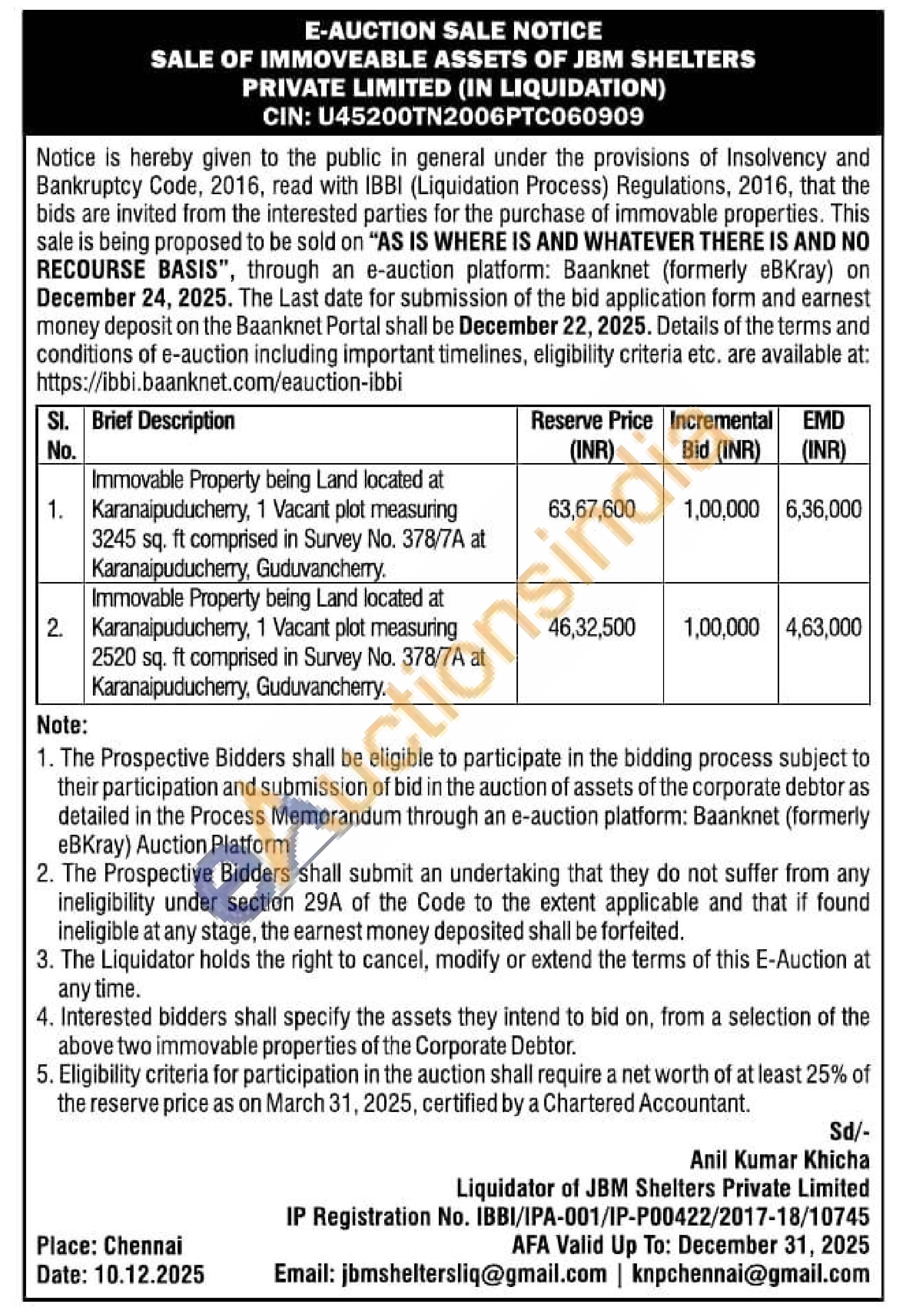 Immovable Property being Land located at 2. Karanaipuducherry, 1 Vacant plot measuring 2520 sq. ft comprised in Survey No. 378/7A at Karanaipuducherry, Guduvancherry.