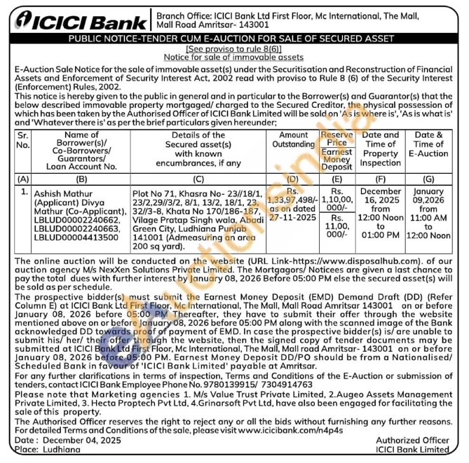 Plot No 71, Khasra No- 23//18/1, 23/2,29//3/2, 8/1, 13/2, 18/1, 23, 32//3-8, Khata No 170/186-187, Vilage Pratap Singh wala, Abadi Green City, Ludhiana Punjab 141001 (Admeasuring an area 200 sq yard).