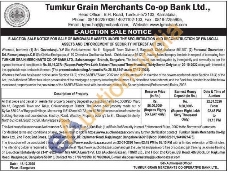 All that piece and parcel of residential property bearing Bagepalli purasabha khatha No. 3068/2D, Ward No.13, Bagepalli Town and Taluk, Chikkaballapura District. The above said property made out of Sy No.550 2A of Bagepalli village. Measuring 115 42 and 40°33 total 6150 feet construction of residential building thereon and bounded on: East by: Road, West by: Property belong's to Sri. Chalapathi shetty, North by: Road, South by: Sri. Muniyappa's property