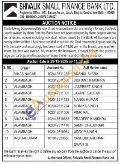 Shivalik Small Finance Bank Ltd Gold Auctions Auction in New Delhi