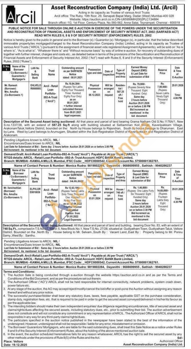 All that piece and parcel of land bearing Grama Natham Old S.No. 1176A/1, New S.no.1337/38, with an extend of 587.25 Sq.ft along with building situated at Selliamman Koil Street, Kaveripakkam Village, Arakonam Taluk, Vellore District, bounded on the: North by House belongs to Rajendran, South by house belongs to Dharuman. East by Lane. West by Land belongs to Arumugam, Situated within the Sub-Registration District of Kaveripakkam and Registration District of Arakonam.