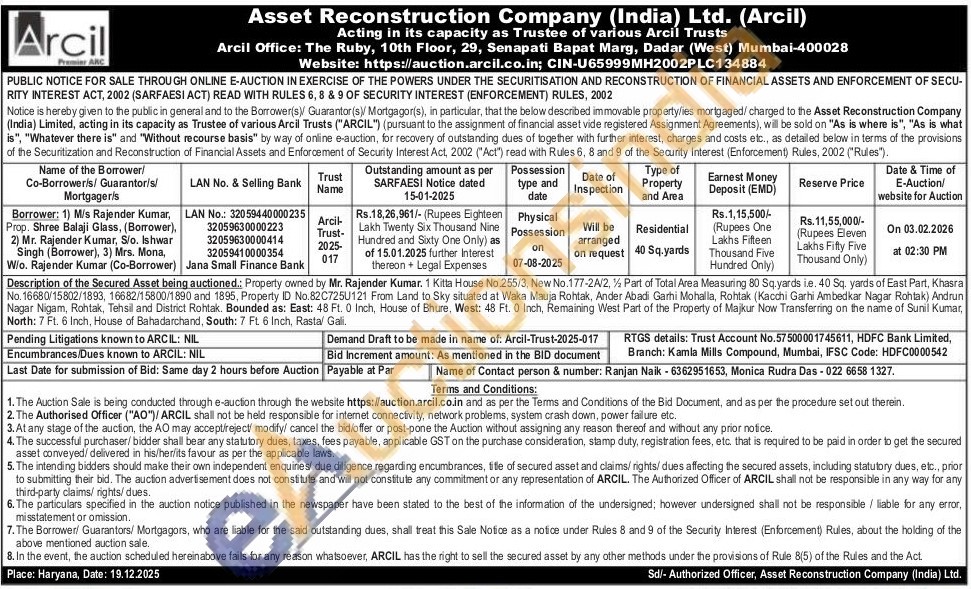 Description of the Secured Asset being auctioned.: Property owned by Mr. Rajender Kumar. 1 Kitta House No.255/3, New No.177-2A/2, ½ Part of Total Area Measuring 80 Sq.yards i.e. 40 Sq. yards of East Part, Khasra No. 16680/15802/1893, 16682/15800/1890 and 1895, Property ID No.82C725U121 From Land to Sky situated at Waka Mauja Rohtak, Ander Abadi Garhi Mohalla, Rohtak (Kacchi Garhi Ambedkar Nagar Rohtak) Andrun Nagar Nigam, Rohtak, Tehsil and District Rohtak. Bounded as: East: 48 Ft. 0 Inch, House of Bhure, West: 48 Ft. 0 Inch, Remaining West Part of the Property of Majkur Now Transferring on the name of Sunil Kumar, North: 7 Ft. 6 Inch, House of Bahadarchand, South: 7 Ft 6 Inch, Rasta/ Gali