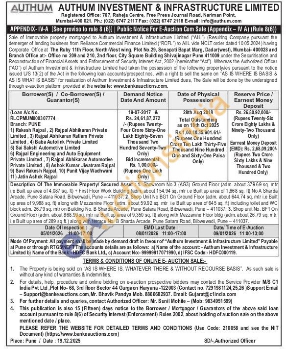 Description Of The Immovable Property/ Secured Asset: 1. Showroom No.3 (AG3) Ground Floor (adm. about 379.69 sq. mtr i,e Built up area of 4,087 sq. ft) + First Floor Work Building (adm. about 154.94 sq. mtr i.e Built up area of 1,668 sq. ft) No A Sharda Arcade, Pune Satara Road, Bibwewadi, Pune 411037. 2. Shop Unit No BG1 On Ground Floor (adm, about 644.74 sq. mtr i,e Built up area of 9,988 sq. ft) along with Mezzanine Floor (adm. about 59.92 sq. mtr ie Built up area of 645 sq. ft) including toilet and WC block adm. 26.79 sq. mtr on Building No. B Sharda Arcade, Pune Satara Road, Bibwewadi, Pune 411037. 3. Shop unit No. BF1 On Ground Floor (adm. about 868.99 sq. mtr ie Built up area of 9,350 sq. ft) along with Mezzanine Floor bidg (adm. about 26.79 sq. mtr. i,e Built up area of 289 sq ft.) along with terrace No. B Sharda Arcade, Pune Satara Road, Bibwewadi, Pune 411037
