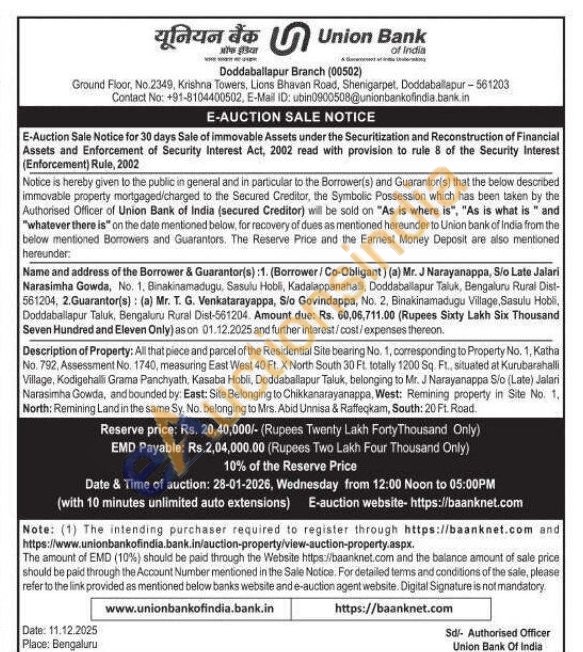 Description of Property: All that piece and parcel of the Residential Site bearing No. 1, corresponding to Property No. 1, Katha No. 792, Assessment No. 1740, measuring East West 40 Ft. X North South 30 Ft. totally 1200 Sq. Ft., situated at Kunubarahalli Village, Kodigehalli Grama Panchyath, Kasaba Hobli, Doddaballapur Taluk, belonging to Mr. J. Narayanappa S/o (Late) Jalari Narasimha Gowda, and bounded by: East: Site Belonging to Chikkanarayanappa, West: Remining property in Site No. 1, North: Remining Land in the same Sy. No. belonging to Mrs. Abid Unnisa & Raffeqkam, South: 20 Ft. Road.