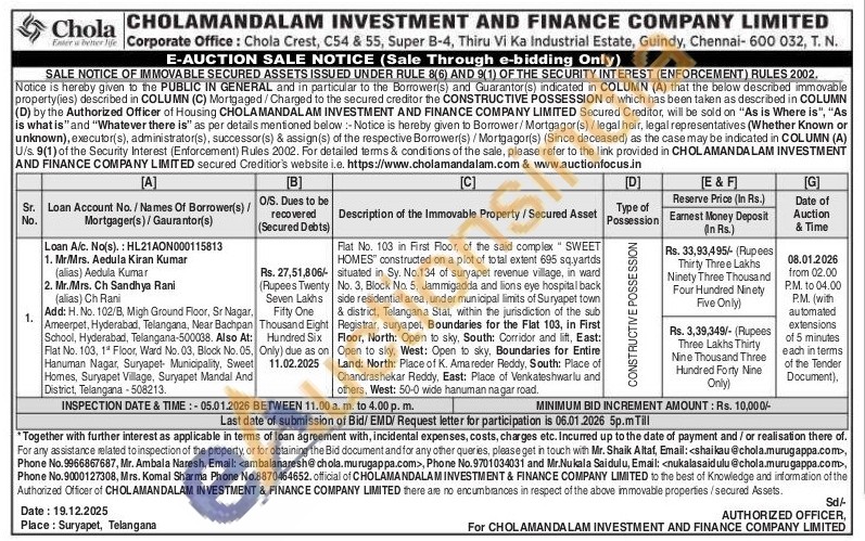 Flat No. 103 in First Floor, of the said complex" SWEET HOMES" constructed on a plot of total extent 695 sq.yartds situated in Sy. No.134 of suryapet revenue village, in ward No. 3, Block No. 5, Jammigadda and lions eye hospital back side residential area, under municipal limits of Suryapet town & district, Telangana Stat, within the jurisdiction of the sub Registrar, suryapet, Boundaries for the Flat 103, in First Floor, North: Open to sky, South: Corridor and lift, East: Open to sky, West: Open to sky, Boundaries for Entire Land: North: Place of K. Amareder Reddy, South: Place of Chandrashekar Reddy, East: Place of Venkateshwarlu and others, West: 50-0 wide hanuman nagar road.