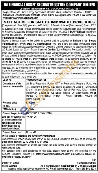 All That Piece And Parcel Of The Residential Property Patta No. 31, Measuring 100.50 Sq. Yards Situated At Village - Dungariya Khurd, Gram Panchayat Kadel, Tehsil Pushkar, Dist- Ajmer Rajasthan Bounded As East House Of Bhanwarlal, West House Of Noratmal, North Road, South House Of Ramswaroop Tej