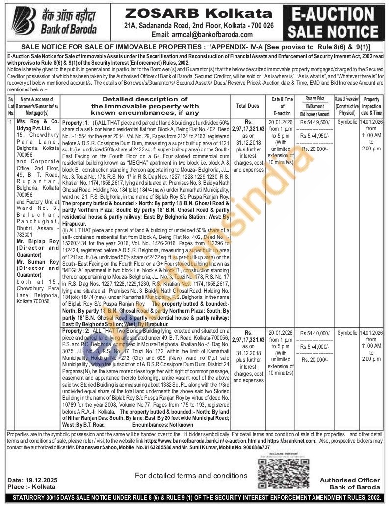 Property: 1: (I) ALL THAT piece and parcel of land & building of undivided 50% share of a self-contained residential flat from Block A, Being Flat No. 402, Deed No. 1-11554 for the year 2014, Vol. No. 29, Pages from 2134 to 2163, registered before A.D.S.R. Cossipore Dum Dum, measuring a super built up area of 1121 sq. ft. (i.e. undivided 50% share of 2422 sq. ft. super-built-up area) on the South-East Facing on the Fourth Floor on a G+ Four storied commercial cum residential building known as "MEGHA" apartment in two block i.e. block A & block B, construction standing thereon appertaining to Mouza- Belghoria, J.L. No. 3, Touzi No. 178, R.S. No. 17 in R.S. Dag Nos. 1227, 1228,1229, 1230, R.S. Khatian No. 1174,1858,2617, lying and situated at Premises No. 3, Baidya Nath Ghosal Road, Holding No. 184 (old) 184/4 (new) under Kamarhati Municipality, ward no. 21, P.S. Belghoria, in the name of Biplab Roy Sío Puspa Ranjan Roy. The property butted & bounded:- North: By partly 18' B.N. Ghosal Road & partly Northern Plaza: South: By partly 18' B.N. Ghosal Road & partly residential house & partly railway: East: By Belghoria Station; West: By Hirapukur.