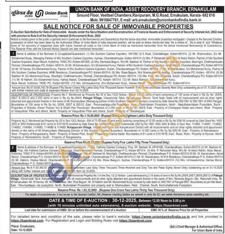 Property No 2: Mentioned as Property No 25 in Soc. 13(2) Notice: EM of 73.50 ares of land and a building comprising of 12.50 cents in Re Sy No. 509/18 covered by Sale Deed No. 1405/2005 in SRO Kalieicode & 61 cents in 510/1818 covered by Sale Deed No. 1406/2005 in SRO Kollemcode (Old Sy No. 1691,1692,1693 81694) in Door Nos. 11/468, 11/4681, 11/4682 11/4683, 11/4684, 11/4685, 11:4686 & 11/4687 Kulappuram Village, Vilavancode Taluk and Kanyakumari District with all improvements and all other rights attached and appurtenant thereto in the name of Mr. Shamsudeen (Managing Director of Mis Southern Cashew Exporters). Boundaries of 12.500 cents in Re Sy No.509/18: East: Property off Ramaswamy West: Property of Rangaswamy, North: Property of Sarala Pillai, South Property of Thanka Nadar Boundaries of 61 cants in 510/181B: East Road, West: Property of Arjunan. North: Property of Ramalakshmi, South Property of Rangaswamy