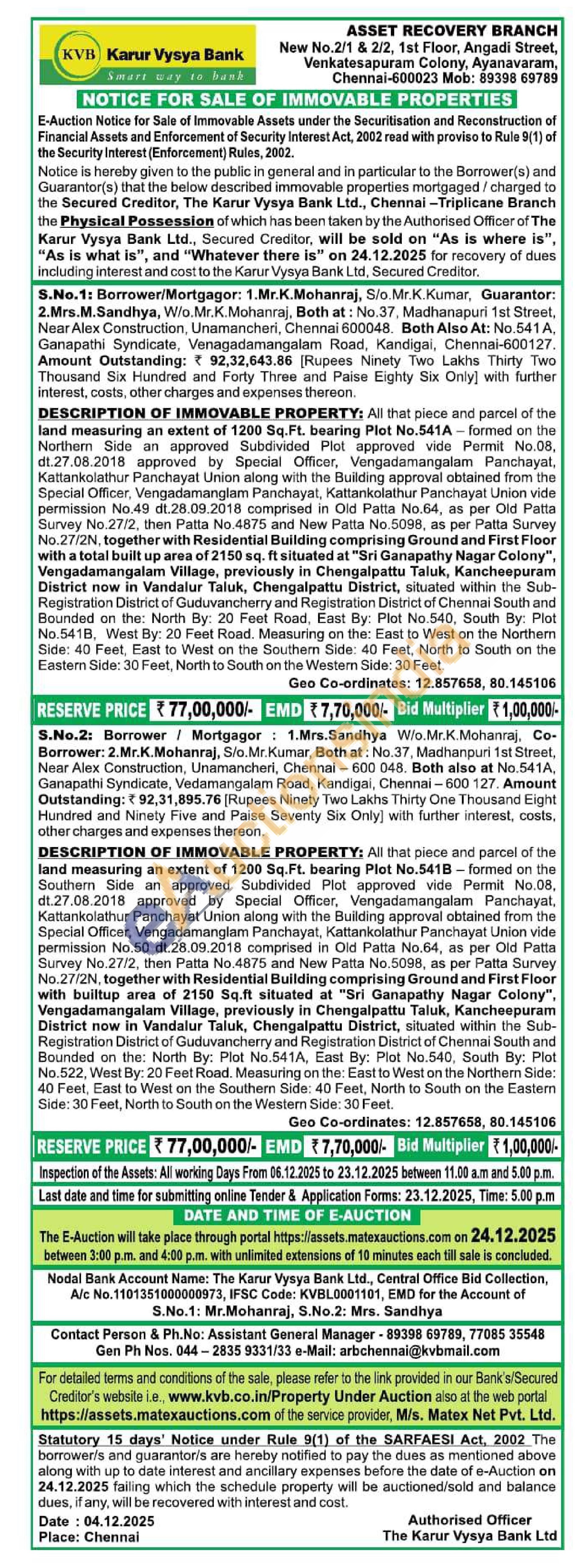 Contact Person & Ph.No: Assistant General Manager - 89398 69789, 77085 35548 Gen Ph Nos. 044-2835 9331/33 e-Mail: arbchennai@kvbmail.com