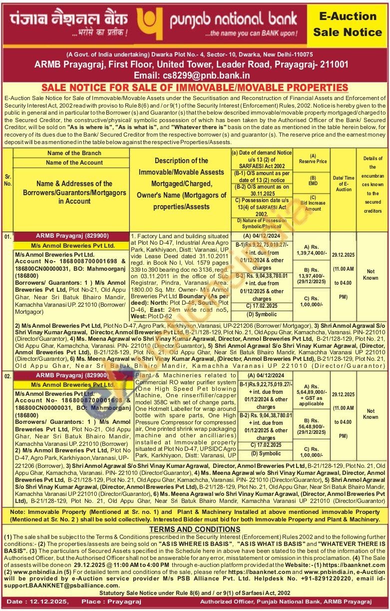 1. Factory Land and building situated at Plot No D-47, Industrial Area Agro Park, Karkhiyaon, Distt: Varanasi, UP vide Lease Deed dated 31.10.2011 regd. in Book No 1, Vol. 1579 pages 339 to 390 bearing doc no 3136. regd. on 03.11.2011 in the office of Sub Registrar, Pindra. Varanasi. Area: 1800.00 Sq. Mtr. Owner- Mi's Anmol Breweries Pvt Ltd Boundary (As per D-46, East: 24m wide road no5, West: Plot D-62 deed): North: Plot D-48, South: Pict