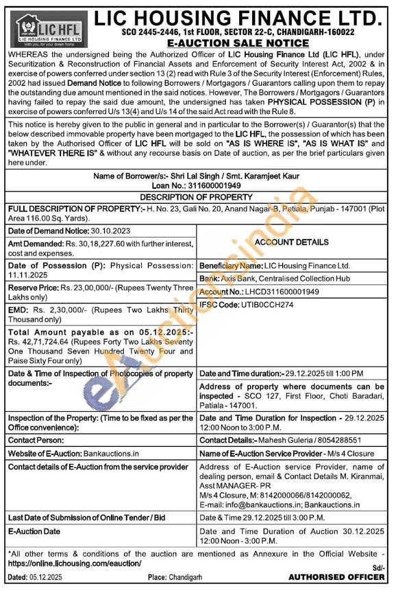 H. No. 23, Gali No. 20, Anand Nagar-B, Patiala, Punjab-147001 (Plot Area 116.00 Sq. Yards).