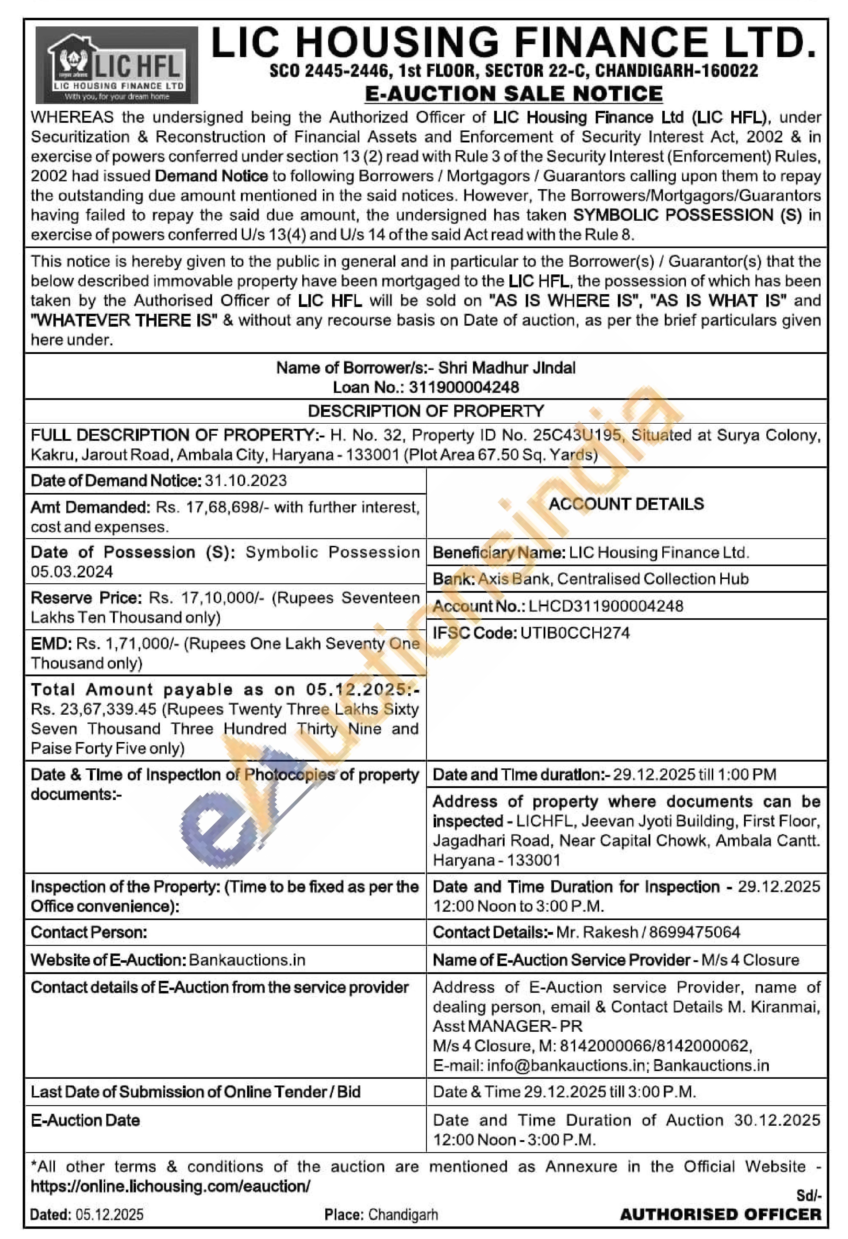FULL DESCRIPTION OF PROPERTY:- H. No. 32, Property ID No. 25C43U195, Situated at Surya Colony, Kakru, Jarout Road, Ambala City, Haryana-133001 (Plot Area 67.50 Sq. Yards)