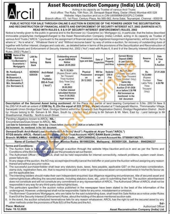All the Piece and parcel of land bearing Comprised in S.No. 295/1A New S No.295/1A1A with an extent of 2398 Sq. ft, (On the equal of 222.79 Sqr., Meter) situated at T. Vadugapatti Mazira, Thimmanallur Village, Sanarpatti Union Dindigul East Taluk, Dindigul District within the Sanarpalti Sub Registration District, Dindigul Registration District North by: House belong to Mr. Selvam & Mr. Mani, South by Vacant land belong to Mr Selvam & Mr. Mani, East by: Land belongs to Mr Sheethammal, West By: North to south Street.