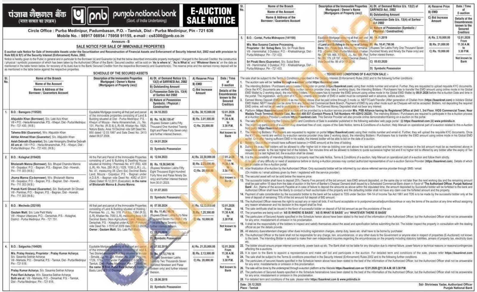 Contact No : 98917 08854/75958 91155, e-mail: cs8300@pnb.co.in