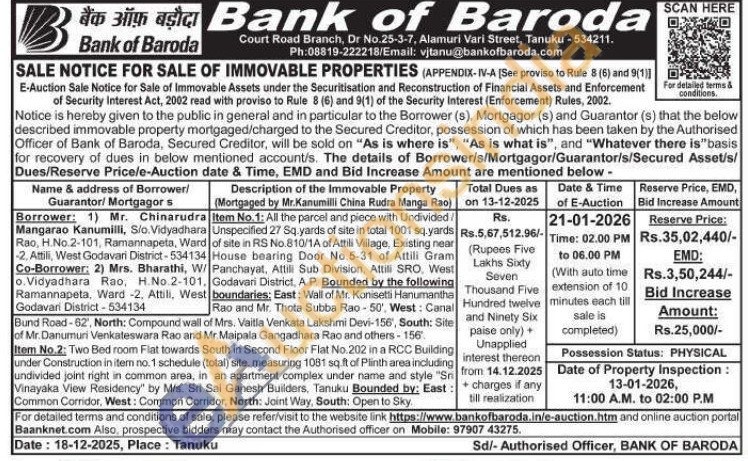No. 1: All the parcel and piece with Undivided/ Unspecified 27 Sq yards of site in total 1001 sq.yards of site in RS No.810/1A of Attili Village, Existing near House bearing Door No.5-31 of Attili Gram Panchayat, Attill Sub Division, Attili SRO, West Godavari District, A P. Bounded by the following boundaries: East: Wall of Mr. Konisetti Hanumantha Rao and Mr. Thota Subba Rao-50', West: Canal Bund Road-62, North: Compound wall of Mrs. Vaitla Venkata Lakshmi Devi-156', South: Site of Mr. Danumuri Venkateswara Rao and Mr.Maipala Gangadhara Rao and others-156 Item No.2: Two Bed room Flat towards South in Second Floor Flat No.202 in a RCC Building under Construction in item no. 1 schedule (total) site, measuring 1081 sq.ft of Plinth area including undivided joint right in common area, in an apartment complex under name and style "Sn Vinayaka View Residency" by Mis. Sri Sai Ganesh Builders, Tanuku Bounded by: East: Common Corridor, West: Common Corridor, North: Joint Way, South: Open to Sky.