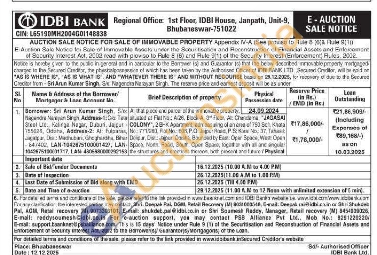 All that piece and parcel of the immovable property, 24.09.2024 situated at Flat No.: A/26, Block-A, 3 Floor, At: Chandama, "JAGASAI - COLONY", 2 BHK Apartment, admeasuring of an area of 750 Sqlt. Khata , No: 771/280, Plot No.: 608, P.O: Jajpur Road, P.S: Koral No.: 37, Tahasil: Dolipur, Dist: Jajpur, Odisha, Bounded by East: Open Space, West: Open Space, North: Road, South: Open Space, together with all and singular the structures and erections thereon, both present and future/Physical