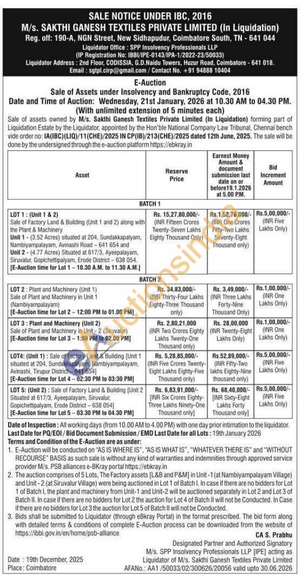 LOT 5: (Unit 2): Sale of Factory Land & Building [Unit 2 Situated at 617/3, Ayeepalayam, Siruvalur, Gopichettipalyam, Erode District-638 054