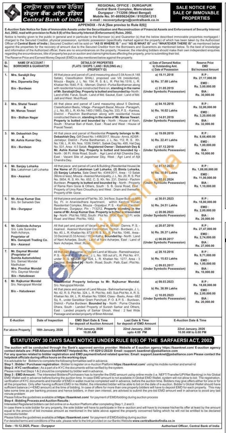 Contact No : Mobile No. 91-8695624204/9102561215 e-mail: recoverydurgro@centralbank.co.in