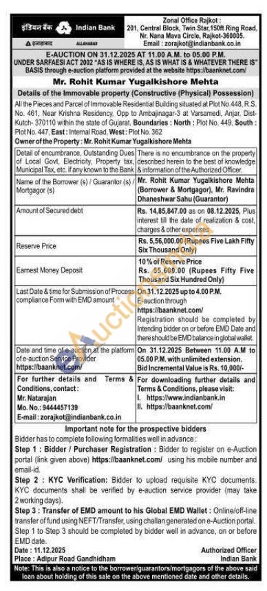 All the Pieces and Parcel of Immovable Residential Building situated at Plot No 448, R.S. No. 461, Near Krishna Residency, Opp to Ambajinagar-3 at Varsamedi, Anjar. Dist-Kutch-370110 within the state of Gujarat. Boundaries: North: Plot No. 449, South: Plot No. 447, East: Internal Road, West: Plot No. 362