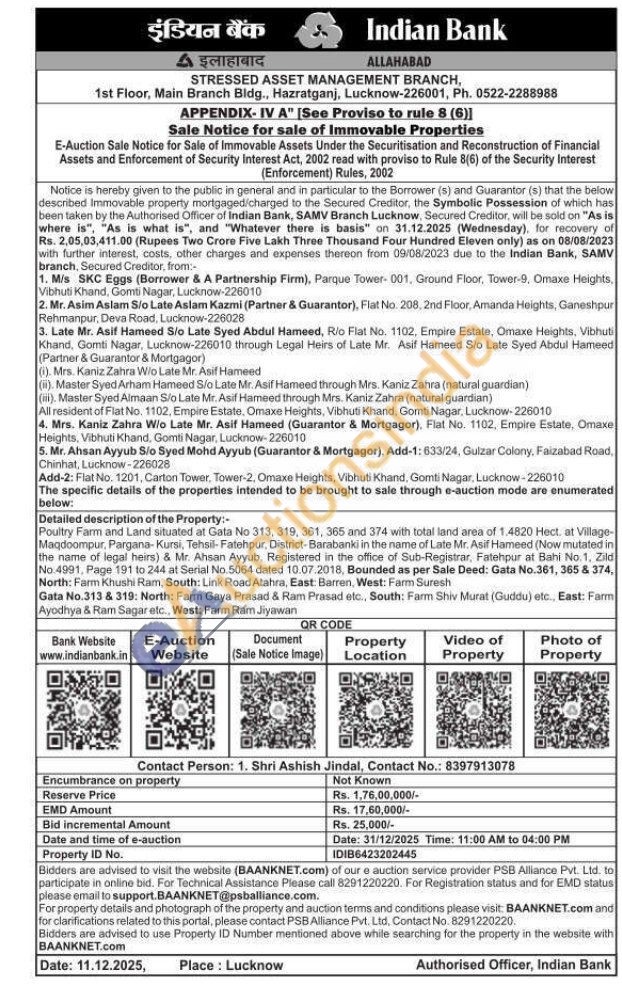 Detailed description of the Property:- Poultry Farm and Land situated at Gata No 313, 319, 361, 365 and 374 with total land area of 1.4820 Hect. at Village-Maqdoompur, Pargana-Kursi, Tehsil-Fatehpur, District-Barabanki in the name of Late Mr. Asif Hameed (Now mutated in the name of legal heirs) & Mr. Ahsan Ayyub, Registered in the office of Sub-Registrar, Fatehpur at Bahi No. 1, Zild No.4991, Page 191 to 244 at Serial No. 5064 dated 10.07.2018, Bounded as per Sale Deed: Gata No.361, 365 & 374, North: Farm Khushi Ram, South: Link Road Atahra, East: Barren, West: Farm Suresh Gata No.313 & 319: North: Farm Gaya Prasad & Ram Prasad etc., South: Farm Shiv Murat (Guddu) etc., East: Farm Ayodhya & Ram Sagar etc., West: Farm Ram Jiyawan