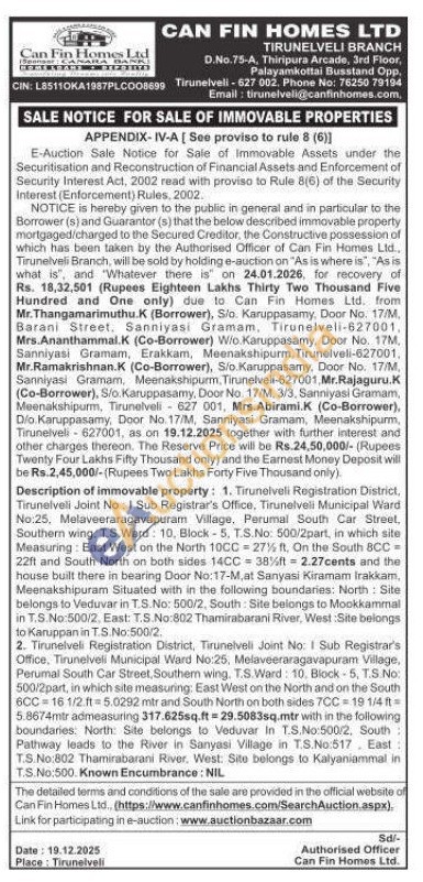 property: 1. Tirunelveli Registration District, Tirunelveli Joint No: 1 Sub Registrar's Office, Tirunelveli Municipal Ward No:25, Melaveeraragavapuram Village, Perumal South Car Street, Southern wing. T.S.Ward: 10, Block-5. T.S.No: 500/2part, in which site Measuring: East West on the North 10CC 27% ft. On the South BCC = 22ft and South North on both sides 14CC38%ft=2.27cents and the house built there in bearing Door No:17-M,at Sanyasi Kiramam Irakkam, Meenakshipuram Situated with in the following boundaries: North: Site belongs to Veduvar in T.S.No: 500/2, South Site belongs to Mookkammal in T.S.No 500/2, East: T.S.No:802 Thamirabarani River, West Site belongs to Karuppan in T.S. No: 500/2, 2. Tirunelveli Registration District, Tirunelveli Joint No: I Sub Registrar's Office, Tirunelveli Municipal Ward No:25, Melaveeraragavapuram Village, Perumal South Car Street, Southern wing, T.S.Ward: 10, Block-5, T.S. No: 500/2part, in which site measuring: East West on the North and on the South 6CC 16 1/2 ft-5.0292 mtr and South North on both sides 7CC-19 1/4 ft 5.8674mtr admeasuring 317.625sq.ft=29.5083sq.mtr with in the following boundaries: North: Site belongs to Veduvar In T.S. No:500/2, South: Pathway leads to the River in Sanyasi Village in T.S.No:517 East: TS. No:802 Thamirabarani River, West: Site belongs to Kalyaniammal in T.S. No:500. Known Encumbrance: NIL