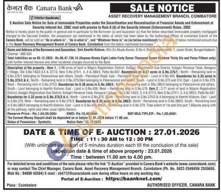 Item 1: 3.98 acres of land in Nilgiris Registration District, Kotagiri Registration Sub District, Kotagiri Revenue Taluk, Kengarai I Village, Old S.No. 143/2,3,4 & 377/3, New S.No.375/1, 3, 4 & 380/3, Patta No.637. Boundaries for 0.27 acres in S.No.375/1: North Remaining land in S.No.375/1 belonging to Palaniammal and others, South Panchayat Road, East Panchayat Road, West-Land in S.No.450. Boundaries for 3.33 acres in S.No.375/3 & 4: North Remaining land in S.No.375/384 belonging to Palaniammal and others. South-Land in S.No.373 and 374, East-Land in S.No.379, West-Remaining land in S.No.375/3. Boundaries for 0.38 acres in S.No.380/3: North Remaining land in SNo.380/3 belonging to Palaniammal and others South Land belonging to Keerthi Kishore, East Land in S.No.439, West-Remaining land in S.No.379. Item 2: 3.71 acres of land in Nilgiris Registration District, Kotagiri Registration Sub District, Kotagiri Revenue Taluk, Kengarai I Village, Old S.No. 143/2, 3, 4 & 377/3, New S.No.375/1, 3, 4 & 380/3. Patta No.637. Boundaries for 3.33 acres in S.No.375/3 & 4: North-Land in S.No.376, South-Remaining land in S.No.375/3 & 4 belonging to Keerthi Kishore, East - Land in S.No 379, West-Remaining land in S.No.375/3. Boundaries for 0.38 acres in S.No.380/3: North Remaining land in S.No.380/2, South Remaining land in S.No. 380/3 belonging to Keerthi Kishore, East-Land in S.No.439, West-Remaining land in S.No.379. Total extent of 1st and 2nd part 7.69acres along with all the pathway rights and other usual rights thereon.