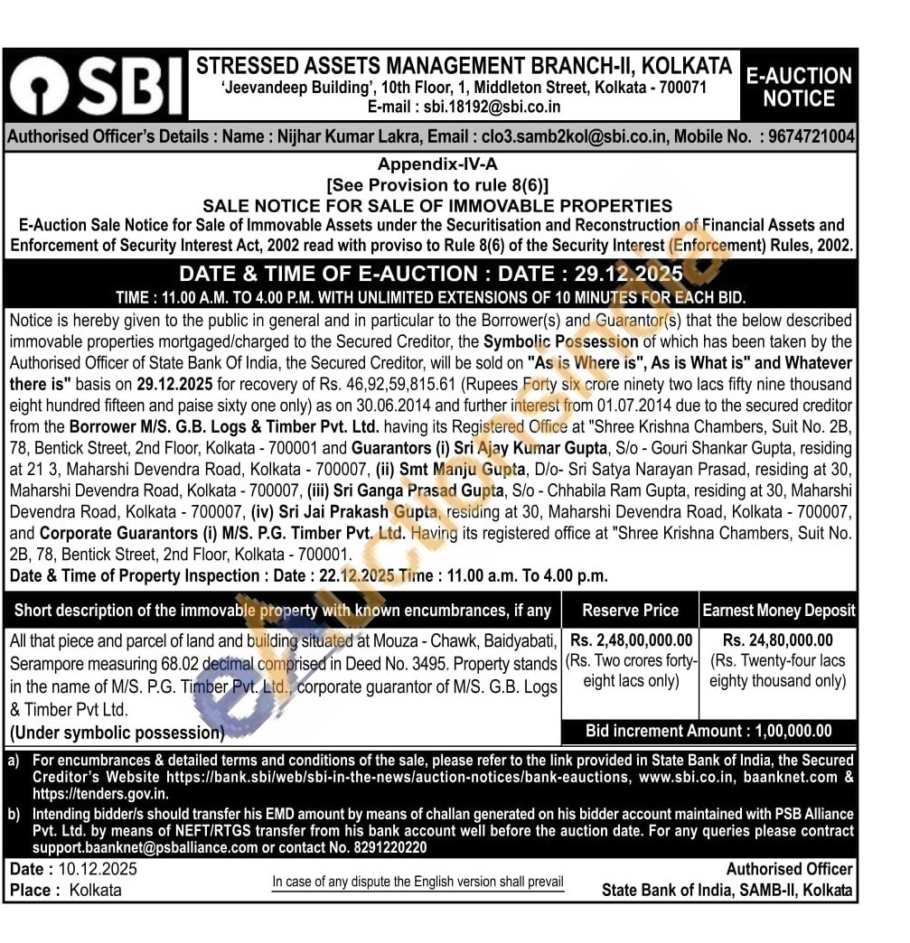 All that piece and parcel of land and building situated at Mouza - Chawk, Baidyabati, Serampore measuring 68.02 decimal comprised in Deed No. 3495. Property stands in the name of M/S. P.G. Timber Pvt. Ltd., corporate guarantor of M/S. G.B. Logs & Timber Pvt Ltd.