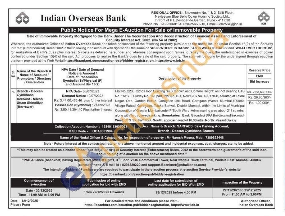Flat No. 2203, 22nd Floor, Building No.3, Known as Contare Height on Plot Bearing CTS Rs. No. 1A/170, Survey No. 161 part, Plot No. B-1, New CTS No. 1/A/170-B, situated at Laxmi Nagar, Opp. Garden Estate, Goregaon Link Road, Goregaon (West), Mumbai-400090, Village Pahadi Goregaon, Taluka Borivali, District Mumbai, within the Limits of Municipal Corporation of Greater Mumbai under P/South Ward. Admeasuring area about 211 sq.mtrs. along with Two covered parking. Boundaries: East: Gaondevi SRA Building and link road, West: CTS No. 1/a/170-A, South: approach road of 18.30 mtrs, North: Vasant Galaxy