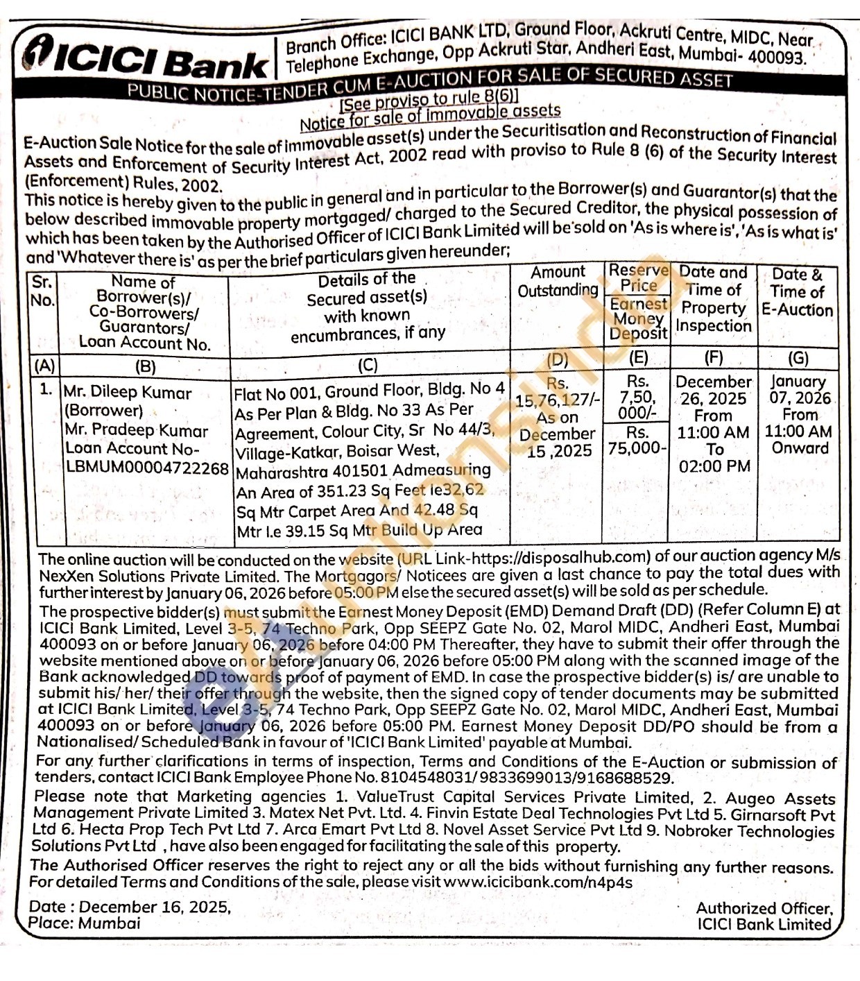 Flat No 001, Ground Floor, Bldg. No 4 As Per Plan & Bldg. No 33 As Per Agreement, Colour City, Sr No 44/3, Village-Katkar, Boisar West, Maharashtra 401501 Admeasuring An Area of 351.23 Sq Feet le32,62 Sq Mtr Carpet Area And 42.48 Sq Mtr l.e 39.15 Sq Mtr Build Up Area
