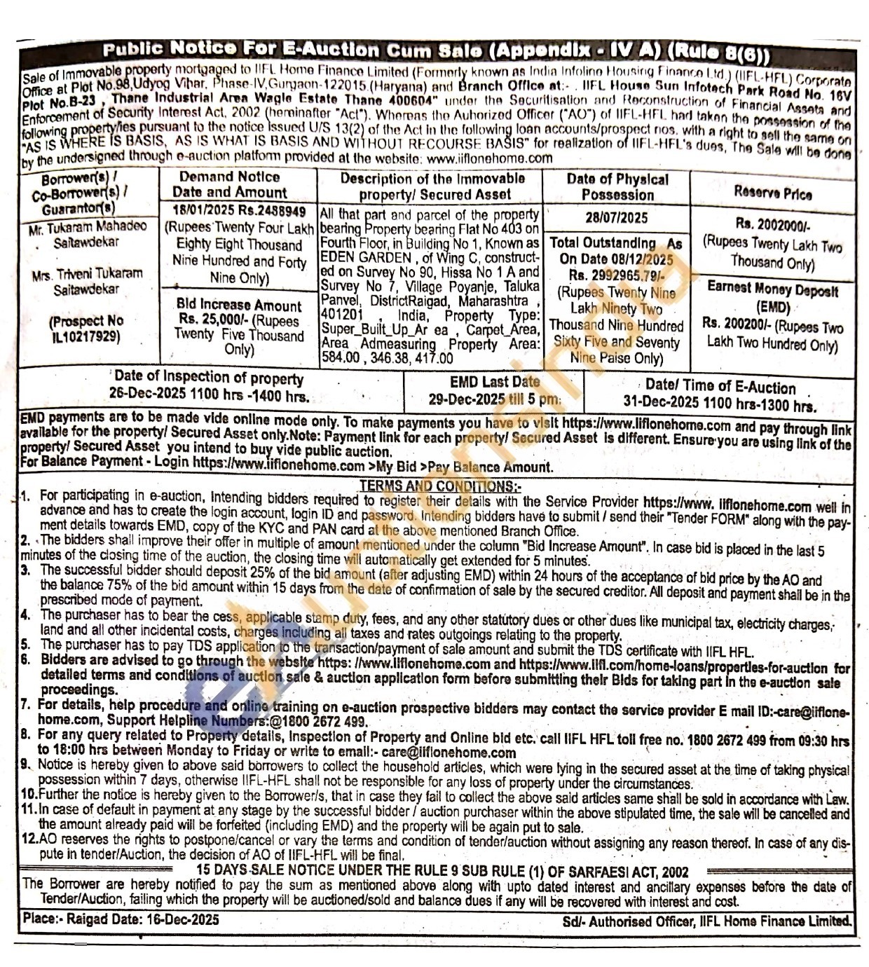 All that part and parcel of the property bearing Property bearing Flat No 403 on Fourth Floor, in Building No 1, Known as EDEN GARDEN, of Wing C, construct-ed on Survey No 90, Hissa No 1 A and Survey No 7, Village Poyanje, Taluka Panvel, DistrictRaigad, Maharashtra 401201 India, Property Type: Super Built Up Area Carpet Area, Area Admeasuring Property Area: 584.00, 346.38, 417.00