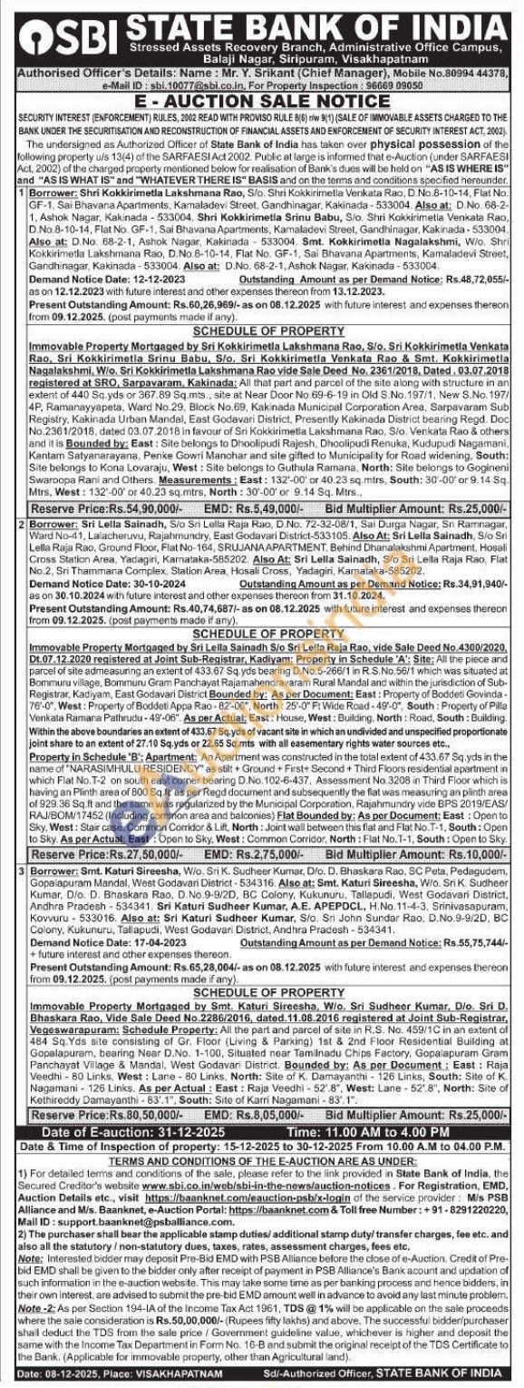 All the piece and parcel of site admeasuring an extent of 433.67 Sq. yds bearing D.No.5-266/1 in R.S.No.56/1 which was situated at Bommuru village, Bommuru Gram Panchayat Rajamahendravaram Rural Mandal and within the jurisdiction of Sub-Registrar, Kadiyam, East Godavari District Bounded by: As per Document: East: Property of Boddet Govinda-76-0, West: Property of Boddeti Appa Rao-82-06", North: 25-0° Ft Wide Road-49-0, South: Property of Pilla Venkata Ramana Pathrudu-49-06" As per Actual: East: House, West: Building, North: Road, South: Building Within the above boundaries an extent of 433.67 Sq.yds of vacant site in which an undivided and unspecified proportionate joint share to an extent of 27.10 Sq.yds or 22.65 Sq.mts with all easementary rights water sources etc., Property in Schedule 'B': Apartment: An Apartment was constructed in the total extent of 433.67 Sq yds in the name of "NARASIMHULU RESIDENCY as stilt + Ground + First Second + Third Floors residential apartment in which Flat No.T-2 on south east corner bearing D.No. 102-6-437, Assessment No.3208 in Third Floor which is having an Plinth area of 800 Sq.ft as per Regd document and subsequently the flat was measuring an plinth area of 929.36 Sq.ft and the same was regularized by the Municipal Corporation, Rajahmundry vide BPS 2019/EAS/RAJ/BOM/17452 (Including common area and balconies) Flat Bounded by: As per Document: East: Open to Sky, West: Stair case, Common Corridor & Lift, North: Joint wall between this flat and Flat No.T-1, South: Open to Sky. As per Actual: East: Open to Sky, West: Common Corridor, North: Flat No.T-1, South: Open to Sky