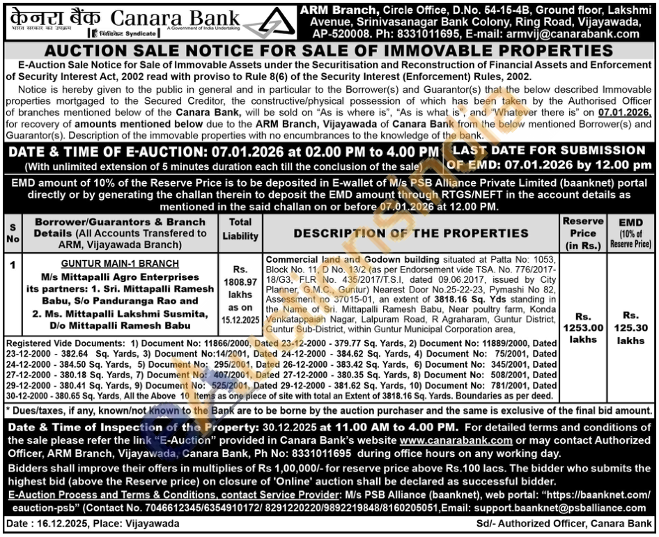 Commercial land and Godown building situated at Patta No: 1053, Block No. 11, D No. 13/2 (as per Endorsement vide TSA. No. 776/2017-18/G3, FLR No. 435/2017/T.S.I, dated 09.06.2017, issued by City Planner, G.M.C., Guntur) Nearest Door No.25-22-23, Pymashi No 82, Assessment no 37015-01, an extent of 3818.16 Sq. Yds standing in the Name of Sri. Mittapalli Ramesh Babu, Near poultry farm, Konda Venkatappaiah Nagar, Lalpuram Road, R Agraharam, Guntur District, Guntur Sub-District, within Guntur Municipal Corporation area Registered Vide Documents: 1) Document No: 11866/2000, Dated 23-12-2000-379.77 Sq. Yards, 2) Document No: 11889/2000, Dated 23-12-2000382.64 Sq. Yards, 3) Document No:14/2001, Dated 24-12-2000384.62 Sq. Yards, 4) Document No: 75/2001, Dated 24-12-2000-384.50 Sq. Yards, 5) Document No: 295/2001, Dated 26-12-2000-383.42 Sq. Yards, 6) Document No: 345/2001, Dated 27-12-2000-380.18 Sq. Yards, 7) Document No: 407/2001, Dated 27-12-2000380.35 Sq. Yards, 8) Document No: 508/2001, Dated 29-12-2000-380.41 Sq. Yards, 9) Document No: 525/2001, Dated 29-12-2000-381.62 Sq. Yards, 10) Document No: 781/2001, Dated 30-12-2000-380.65 Sq. Yards, All the Above 10 Items as one piece of site with total an Extent of 3818.16 Sq. Yards. Boundaries as per deed