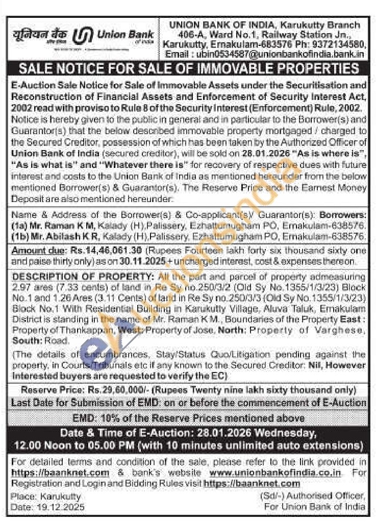 DESCRIPTION OF PROPERTY: All the part and parcel of property admeasuring 2.97 ares (7.33 cents) of land in Re Sy no.250/3/2 (Old Sy No. 1355/1/3/23) Block No.1 and 1.26 Ares (3.11 Cents) of land in Re Sy no.250/3/3 (Old Sy No. 1355/1/3/23) Block No.1 With Residential Building in Karukutly Village, Aluva Taluk, Ernakulam District is standing in the name of Mr. Raman KM., Boundaries of the Property East: Property of Thankappan, West: Property of Jose, North: Property of Varghese, South: Road.