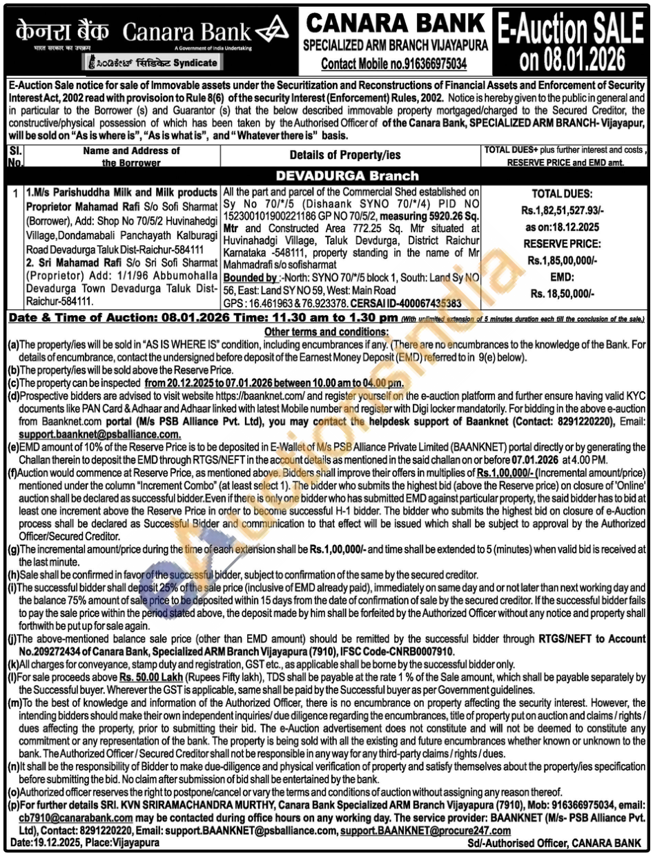 All the part and parcel of the Commercial Shed established on Sy No 70/*/5 (Dishaank SYNO 70/*/4) PID NO 152300101900221186 GP NO 70/5/2, measuring 5920.26 Sq. Huvinahadgi Village, Taluk Devdurga, District Raichur Karnataka -548111, property standing in the name of Mr Mtr and Constructed Area 772.25 Sq. Mtr situated at Mahmadrafi s/o sofisharmat Bounded by:-North: SYNO 70/*/5 block 1, South: Land Sy NO 56, East: Land SY NO 59, West: Main Road GPS: 16.461963 & 76.923378 . CERSAI ID-400067435383