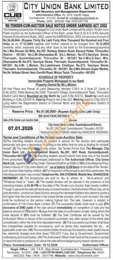 All that Piece and Parcel of Land Measuring Hectare 0:08.5 or 0 Acre 21 Cents in S.No 423/2, Patta Beaning No. 2248, Thervazhi Village, Gummidipoondi Taluk, Thin/valur District Land Being Bounded on the North by Land S. No. 423/10, South by Land and Building in S No. 423/3A1A, East by Road in the S.No. 422, West by Land in S.No 423/10 Lying within the Registration District of Chennai North and Sub Registration District of Gummidipoondi