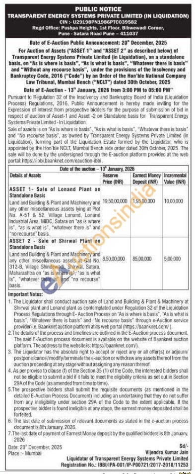 Land and Building & Plant and Machinery and any other miscellaneous assets lying at Plot No. A-51 & 52, Village Lonand, Lonand Industrial Area, MIDC, Satara on "as is where is", "as is what is", "whatever there is" and "no recourse basis ASSET 2 Sale of Shirwal Piant on Standalone Basis