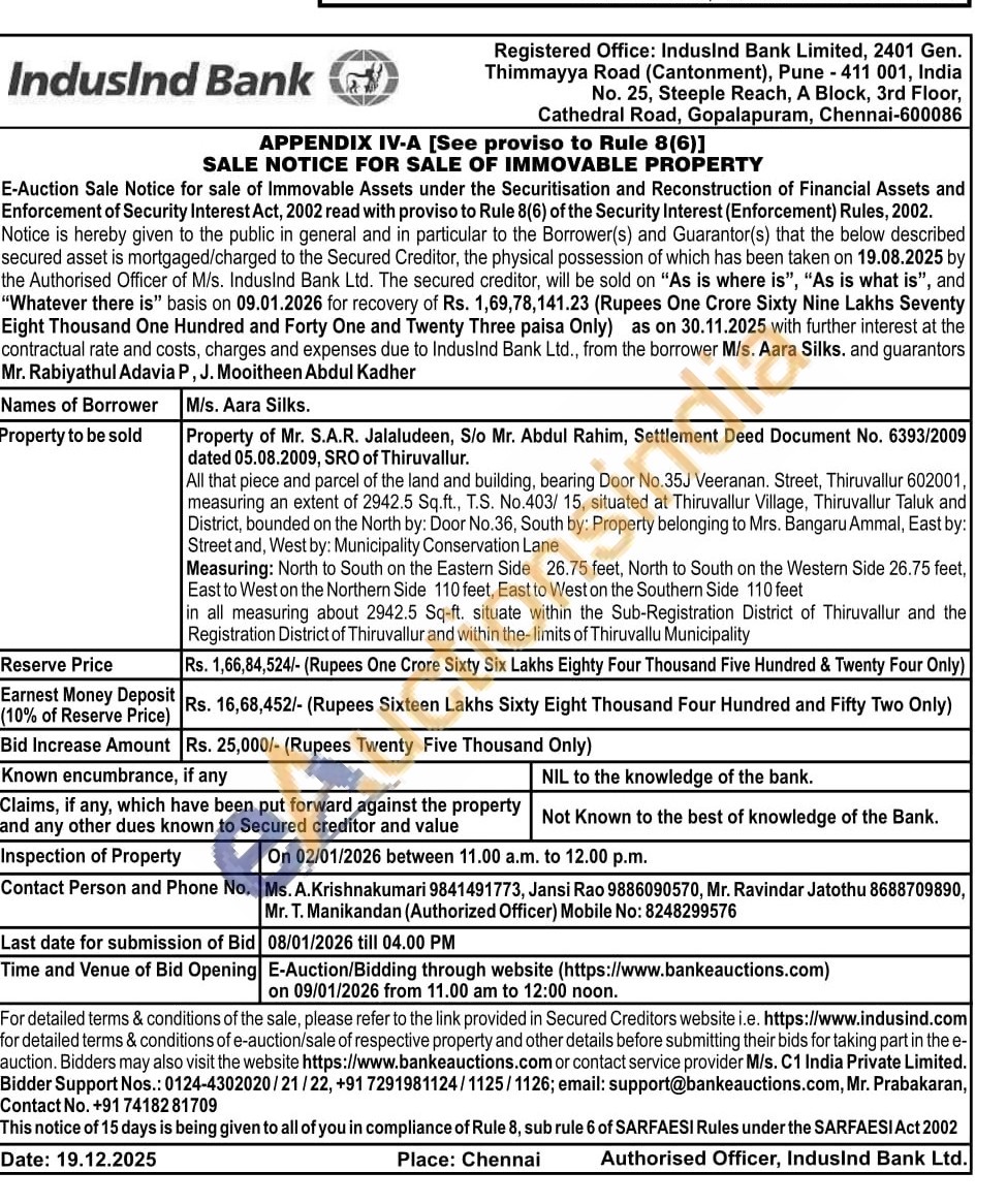 All that piece and parcel of the land and building, bearing Door No.35J Veeranan. Street, Thiruvallur 602001, measuring an extent of 2942.5 Sq.ft., T.S. No.403/ 15, situated at Thiruvallur Village, Thiruvallur Taluk and District, bounded on the North by: Door No.36, South by: Property belonging to Mrs. Bangaru Ammal, East by: Street and, West by: Municipality Conservation Lane Measuring: North to South on the Eastern Side 26.75 feet, North to South on the Western Side 26.75 feet, East to West on the Northern Side 110 feet, East to West on the Southern Side 110 feet in all measuring about 2942.5 Sq-ft. situate within the Sub-Registration District of Thiruvallur and the Registration District of Thiruvallur and within the-limits of Thiruvallu Municipality