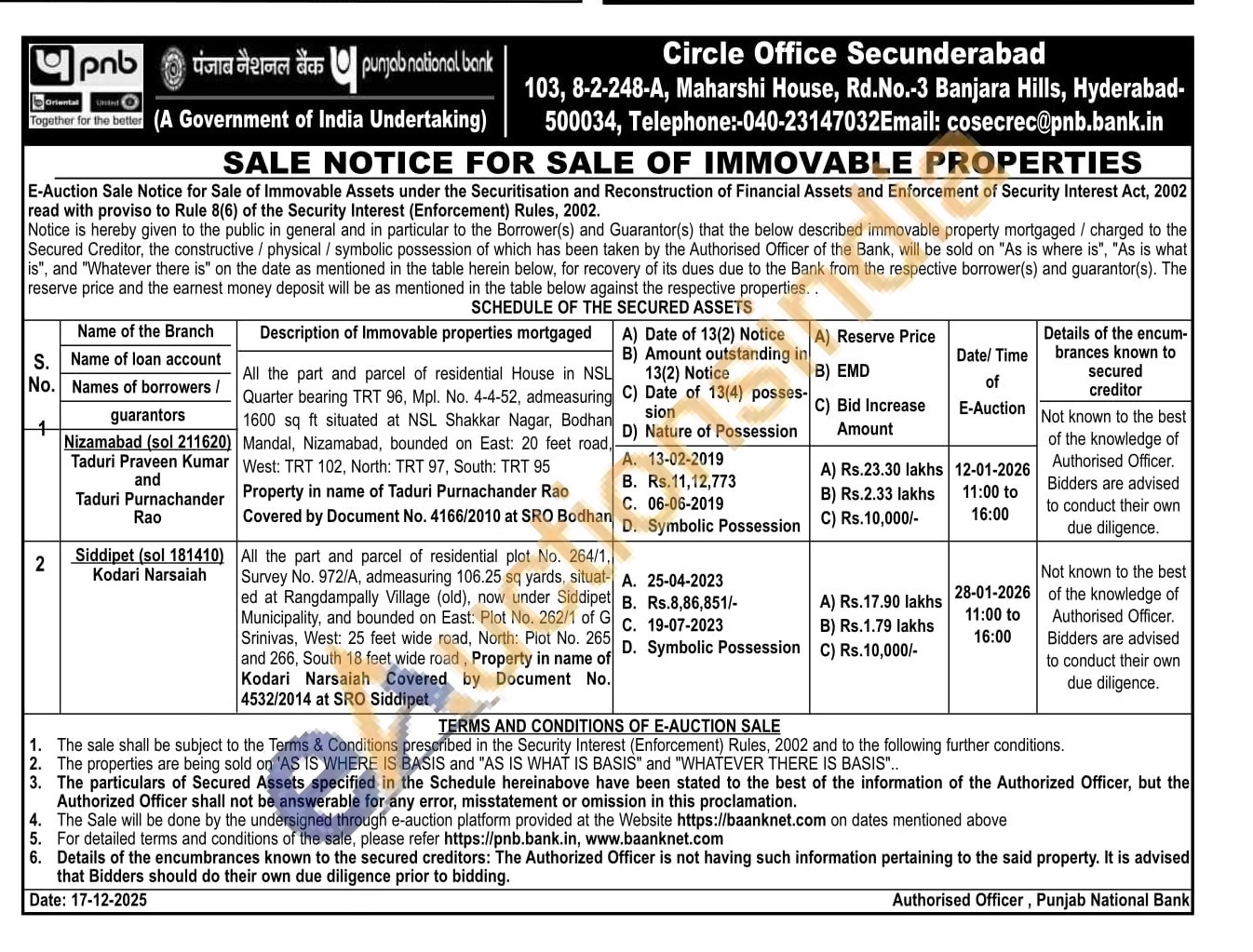 All the part and parcel of residential plot No. 264/1, Survey No. 972/A, admeasuring 106.25 sq yards, situat-ed at Rangdampally Village (old), now under Siddipet Municipality, and bounded on East: Plot No. 262/1 of G Srinivas, West: 25 feet wide road, North: Plot No. 265 and 266, South 18 feet wide road