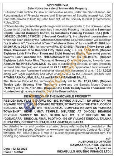 RESIDENTIAL FLAT BEARING NO. 402, HAVING A BUILT-UP AREA OF 705 SQUARE FEETLE. 65.52 SQUARE METERS, SITUATED ON THE 4TH FLOOR OF BUILDING NO. A/2, IN THE RESIDENTIAL COMPLEX KNOWN AS "AMBIKA TOWNSHIP, NEAR UMIYA TEMPLE, SITUATED AT DINDOLI BEARING REVENUE SURVEY NO. 83/1, BLOCK NO. 121, T. P. SCHEME NO. 69 (GODADARA-DINDOLI), FINAL PLOT NO. 109 OF VILLAGE DINDOLI, TALUKA SURAT CITY, DISTRICT SURAT, SURAT-394210, GUJARAT.