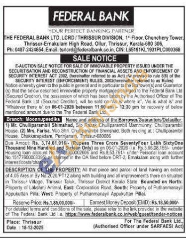 DESCRIPTION OF THE PROPERTY: All that piece and parcel of land having an extent of 4.05 Ares in Sy No 2020/PT12 along with building and all improvements there on situated in Thrissur Village, Thrissur Taluk, Thrissur District Kerala State. Bounded on North: Property of Lakshmi Ammal, East: Corporation Road, South: Property of Puthanmanayil Appukuttan Pila: West: Property of Puthanmanayil Appukuttan Pillai.