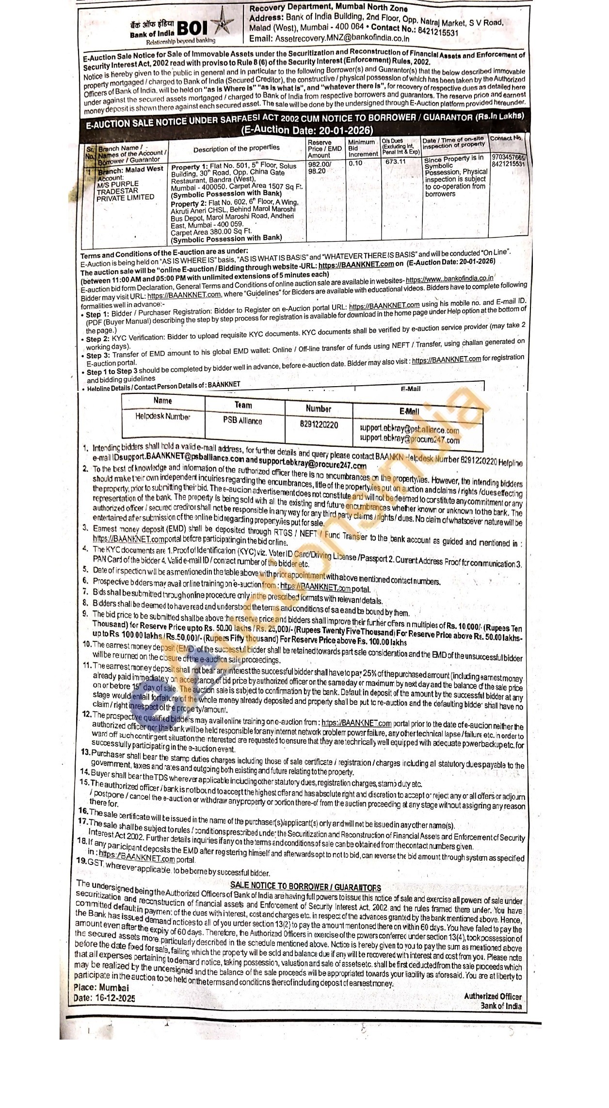 Property 1: Flat No. 501, 5 Floor, Solus Building, 30 Road, Opp. China Gate Restaurant, Bandra (West). Mumbai-400050. Carpet Area 1507 Sq Ft. (Symbolic Possession with Bank) Property 2: Flat No. 602, 6" Floor, A Wing, Akruti Aneri CHSL, Behind Marol Maroshi Bus Depot, Marol Maroshi Road, Andheri East, Mumbai-400 059. Carpet Area 380.00 Sq Ft. (Symbolic Possession with Bank)