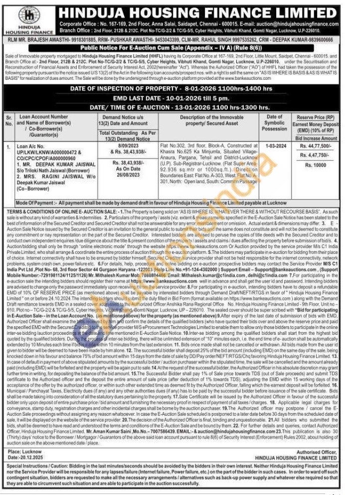 Flat No.302, 3rd floor, Block-A, Constructed at Khasra No.625 Ka Minjumla, Situated Village-Anaura, Pargana, Tehsil and District-Lucknow (U.P). Sub-Registrar-Lucknow (Flat Super Area 92.936 sq.mtr or 1000sq.ft.). Direction Boundares East: Flat No. A-303, West: Flat No.A-301. North: Open land, South: Common Passage