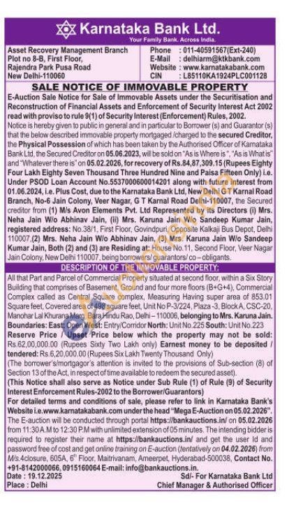 All that Part and Parcel of Commercial Property situated at second floor, within a Six Story Building that comprises of Basement, Ground and four more floors (B+G+4), Commercial Complex called as Central Square complex, Measuring Having super area of 853.01 Square feet, Covered area of 498 square feet, Unit No P-3/224, Plaza-3. Block A, CSC-20, Manohar Lal Khurana Marg, Bara Hindu Rao, Delhi-110006, belonging to Mrs. Karuna Jain. Boundaries: East: Open West: Entry/Corridor North: Unit No. 225 South: Unit No.223