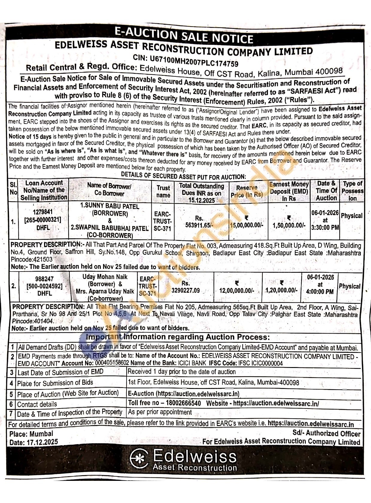 PROPERTY DESCRIPTION:- All That Part And Parcel Of The Property Flat No. 003, Admeasuring 418.Sq. Ft Built Up Area, D Wing, Building No.4, Ground Floor, Saffron Hill, Sy.No.148, Opp Gurukul School, Shirgaon, Badlapur East City :Badlapur East State :Maharashtra Pincode:421503