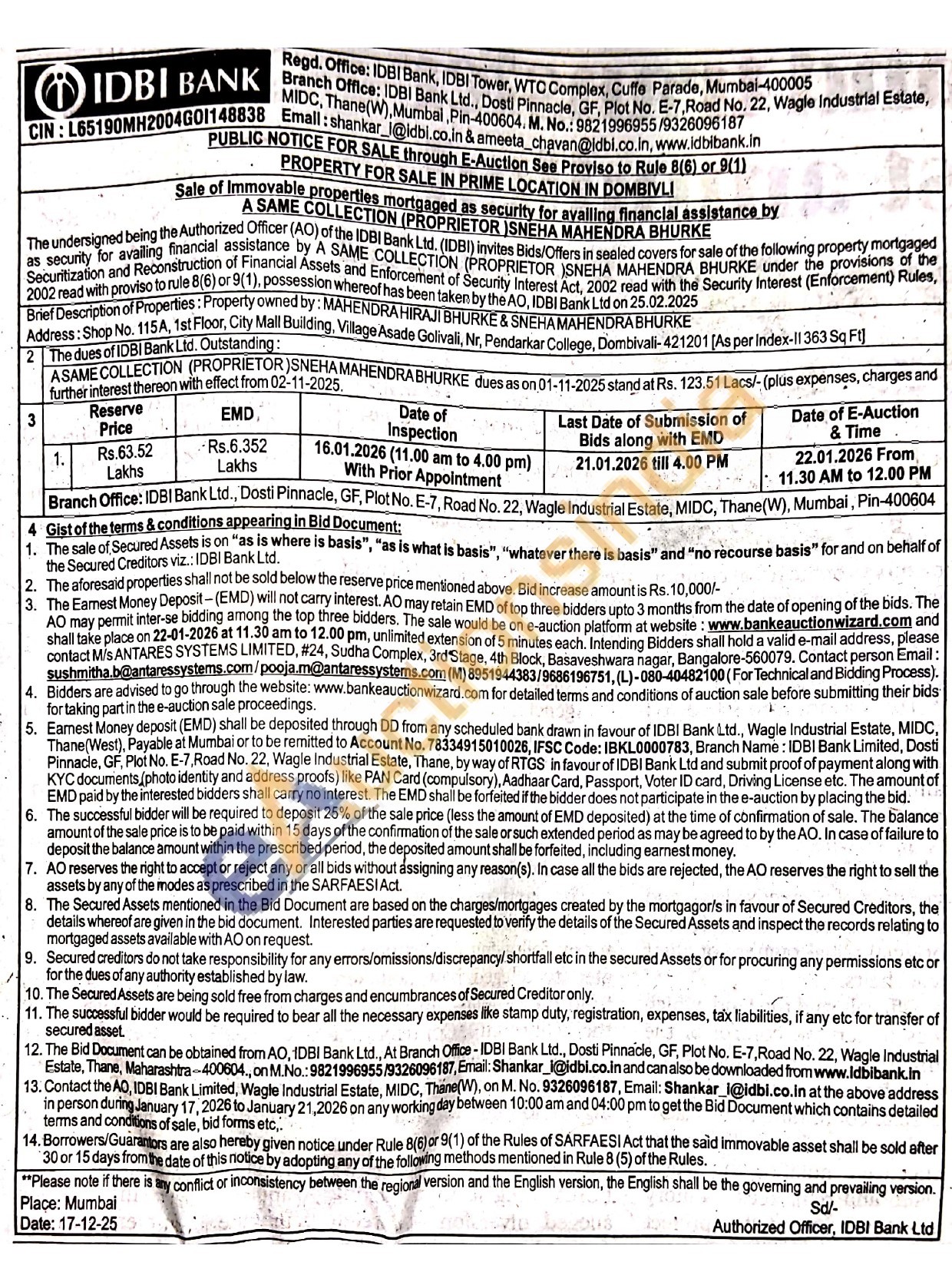 Properties: Property owned by: MAHENDRA HIRAJI BHURKE & SNEHA MAHENDRA BHURKE Address: Shop No. 115A, 1st Floor, City Mall Building , Village Asade Golivali, Nr. Pendarkar College, Dombivali-421201 [As per index-11 363 Sq Ft