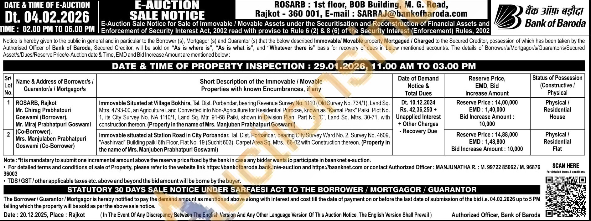 Immovable Situated at Village Bokhira, Tal. Dist. Porbandar, bearing Revenue Survey No. 1110 (Old Survey No. 734/1). Land Sq. Mtrs. 4793-00, an Agriculture Land Converted into Non-Agriculture for Residential Purpose, known as "Kamal Park" Paiki Plot No. 1, its City Survey No. NA 1110/1, Land Sq. Mtr. 91-68 Paiki, shown in Division Plan, Part No. 'C', Land Sq. Mtrs. 30-71, with construction thereon. (Property in the name of Mrs. Manjuben Prabhatpuri Goswami)